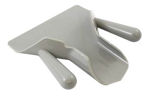 Pá de plástico resistente em tom cinza, ideal para manipular batatas ou outros alimentos fritos, projetada para uso ambidestro.