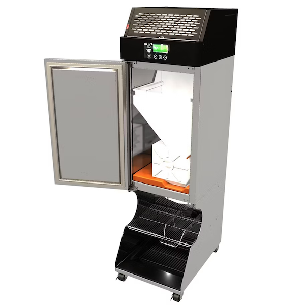 Freezer dispensador de batatas fritas comercial simples com capacidade de armazenamento de até 18 kg de batatas e dispensa cargas configuradas com precisão (+/- 10%) para mais de 350 cestas/hora. Além disso o carregamento dos containers é rápido e conta com alarme de nível baixo de carga.